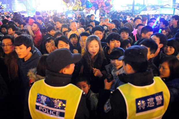 2013年2月24日,正月十五元宵节,郑州人民公园,警察围起人墙,限制不断拥来的人群。