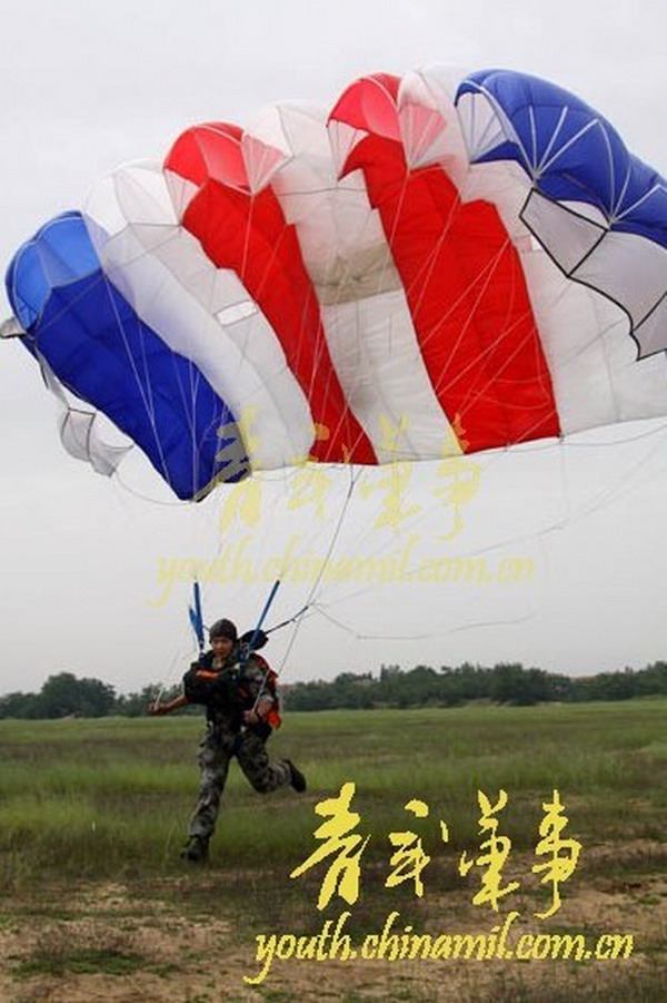 在空降兵这个藏龙卧虎的集体中,想要成为一名优秀的跳伞员,不仅要有过硬的心理素质,而且还要进行“残酷”的地面训练,这也是跳伞训练的基础。第一次踏上离机平台时,看着一个个身手敏捷的男兵从平台上一跃而下,杨晓林就发怵了,教员一声令下:“离机——准备!跳!”杨晓林半天也没敢从1.5米高的平台上跳下,男兵们见状都哈哈大笑。伞训教员则在一旁激励杨晓林说,“谁平台不过关就不准上飞机,如果不跳,你还是到其它单位去吧。”跳还是不跳?两个声音在杨晓林脑海中不停挣扎,最后还是胆量战胜了软弱,杨晓林勇敢地从离机平台跳下了。经过这次平台风波后,杨晓林不想成为男兵们的笑柄,她每天坚持早起半小时去练体能、跳平台、吊环,练胆量、练技能,晚上战友都上床睡觉了,杨晓林还在偷偷地做俯卧撑、仰卧起坐。每一个步骤她都做到极致,只有这样她才能拉近与男兵之间的差距。伞兵中流传这样一句话:三肿三消、才上云霄。经过一个月的艰苦训练,杨晓林进步很明显。在队里面组织共同课目考核中,她的五公里越野只用了21分钟便跑到了终点,俯卧撑能做四五十个,比部分男兵都多,而离机姿势、平台吊环成绩都是优秀。男兵们看了都说:“看不出来啊!当初连离机都不敢跳的丫头现在比我们还牛!”