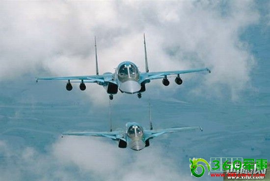 资料图:俄苏-34前线轰炸机双机空中编队飞行。